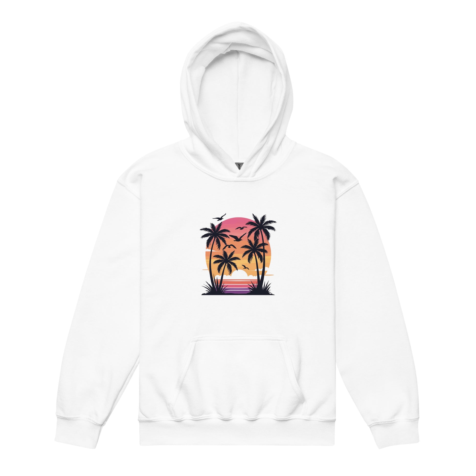 Youth sized white colored soft style sweatshirt with a sunset, palm trees and birds :)